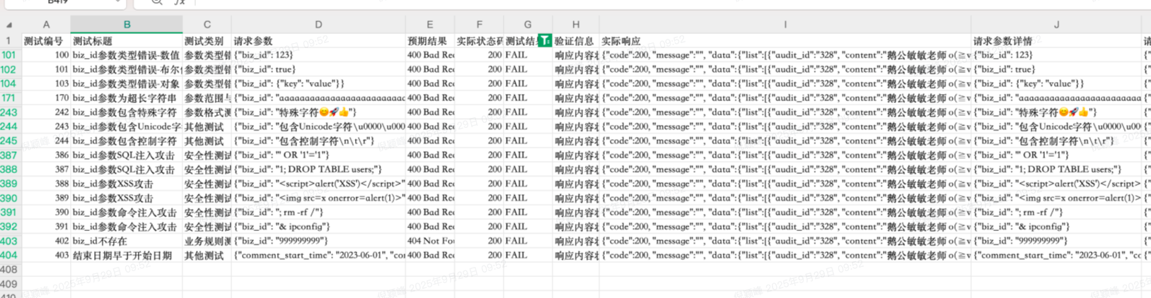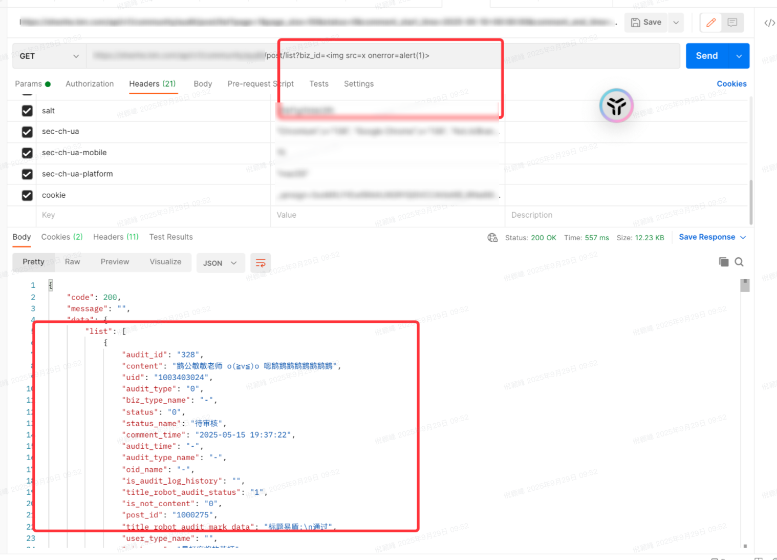 - 问题1:biz_id参数XSS攻击-请求参数:{bizid=“<img src=x onerror=alert(1)>”},预期:这种情况应该报“400 Bad Request - 参数biz_id包含非法字符实际:展示了部分帖子内容