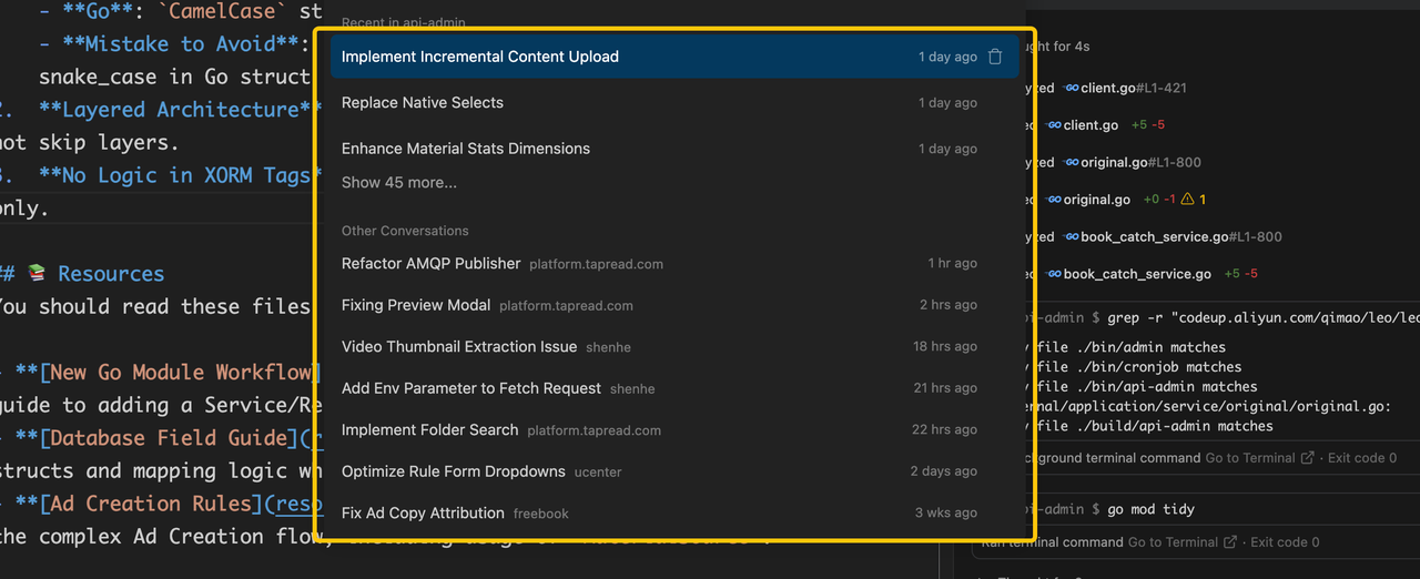 - 零损耗的信息传递: 我只需要告诉 AI “在这个页面增加一个素材上传功能”,AI 同时拥有后端的数据模型(Struct/Schema)和前端的 UI 规范。它不需要“查文档”,因为它知道后端