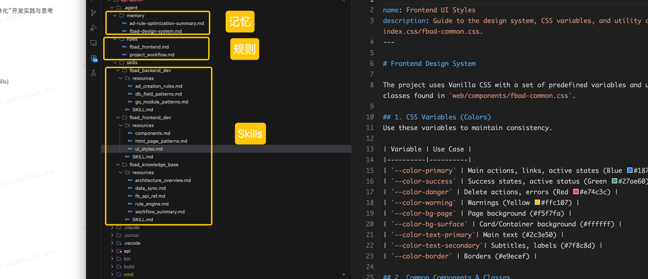 1、建立 .agent 规范体系正如我的项目结构截图所示(见图 ),我在项目中维护了一个 .agent 目录,这不是给代码运行用的,而是给 AI “阅读”用的: